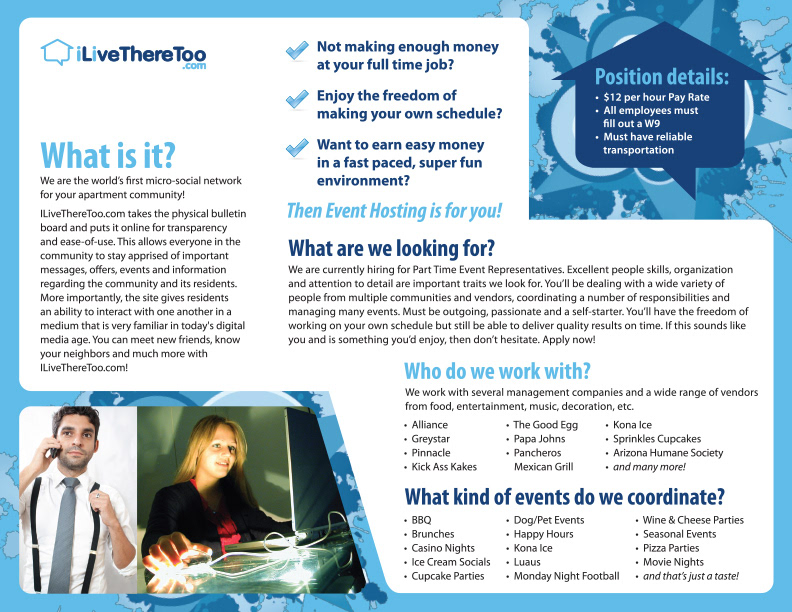 An event planning agency that creates social networking for apartment communities. This project included marketing collateral for all client events as well the company itself.